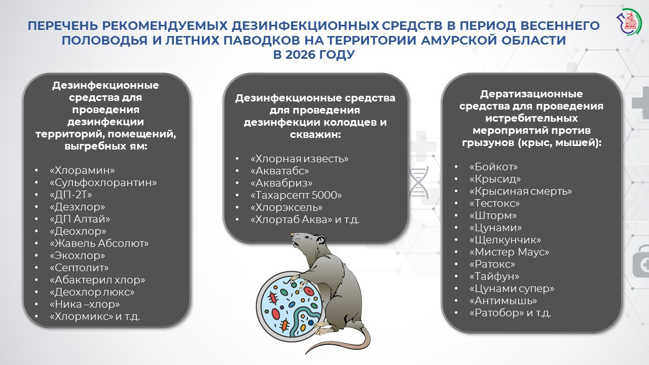 Перечень рекомендуемых дезинфекционных средств в период весеннего половодья и летних паводков на территории Амурской области в 2026 году